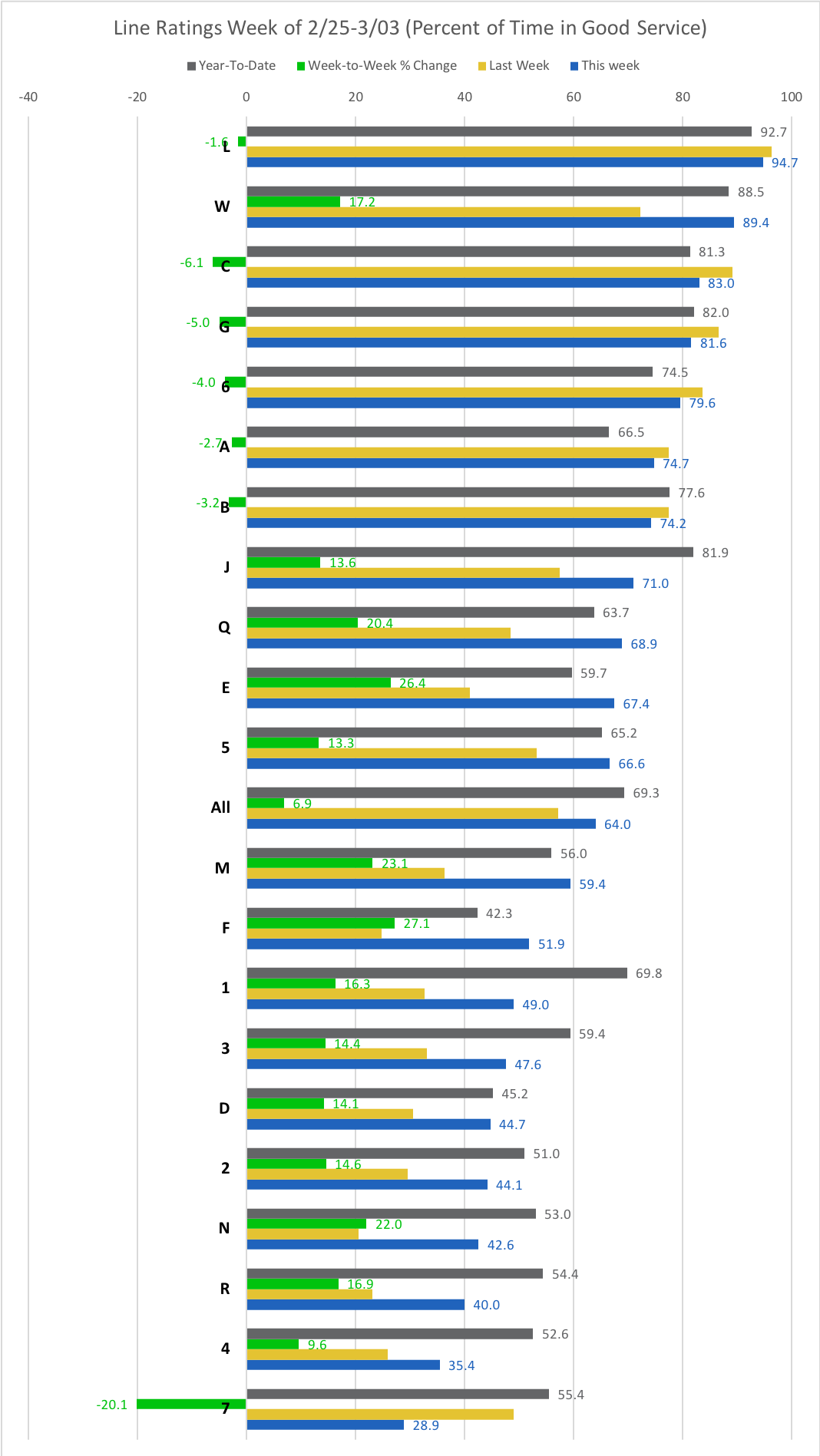 Using the fantastic Subwaystats.com website, I've compiled weekly ratings for each line. Each number represents the percent of time the last week (Monday-to-Sunday) that the line had "Good Service." For example, if the number is 70 percent, that means the line had "Good Service" 70 percent of the time and any form of disruption—planned work, delays, service changes, etc.—the other 30 percent.
